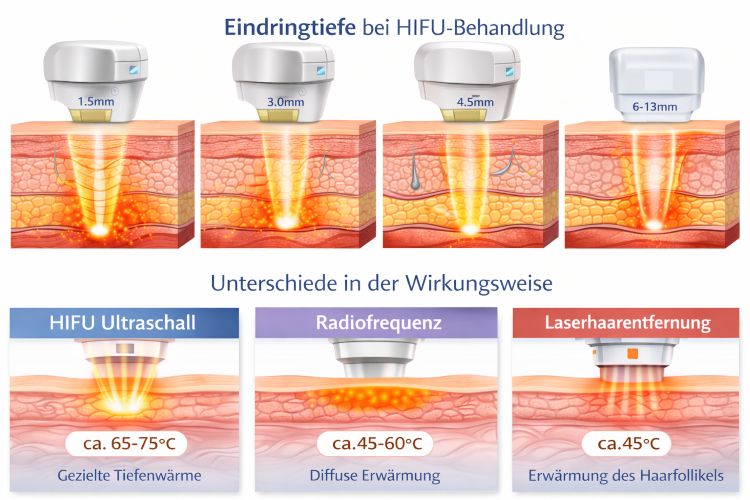 Gegensätzlich zu übrigen Lifting Methoden bei denen das Gewebe gezogen wird, wird bei HIFU das Gewebe geschrumpft. Das funktioniert dadurch, dass HIFU in streng definierten Tiefen des Gewebes, in der Lage ist permanentes Stützgewebe zu produzieren- und das komplett schmerzfrei und ohne dabei die Hautoberfläche zu beeinträchtigen. Weiters reicht bei einer HIFU Behandlung eine einzige Anwendung schon aus um den gewünschten Lifting Effekt zu erzielen.